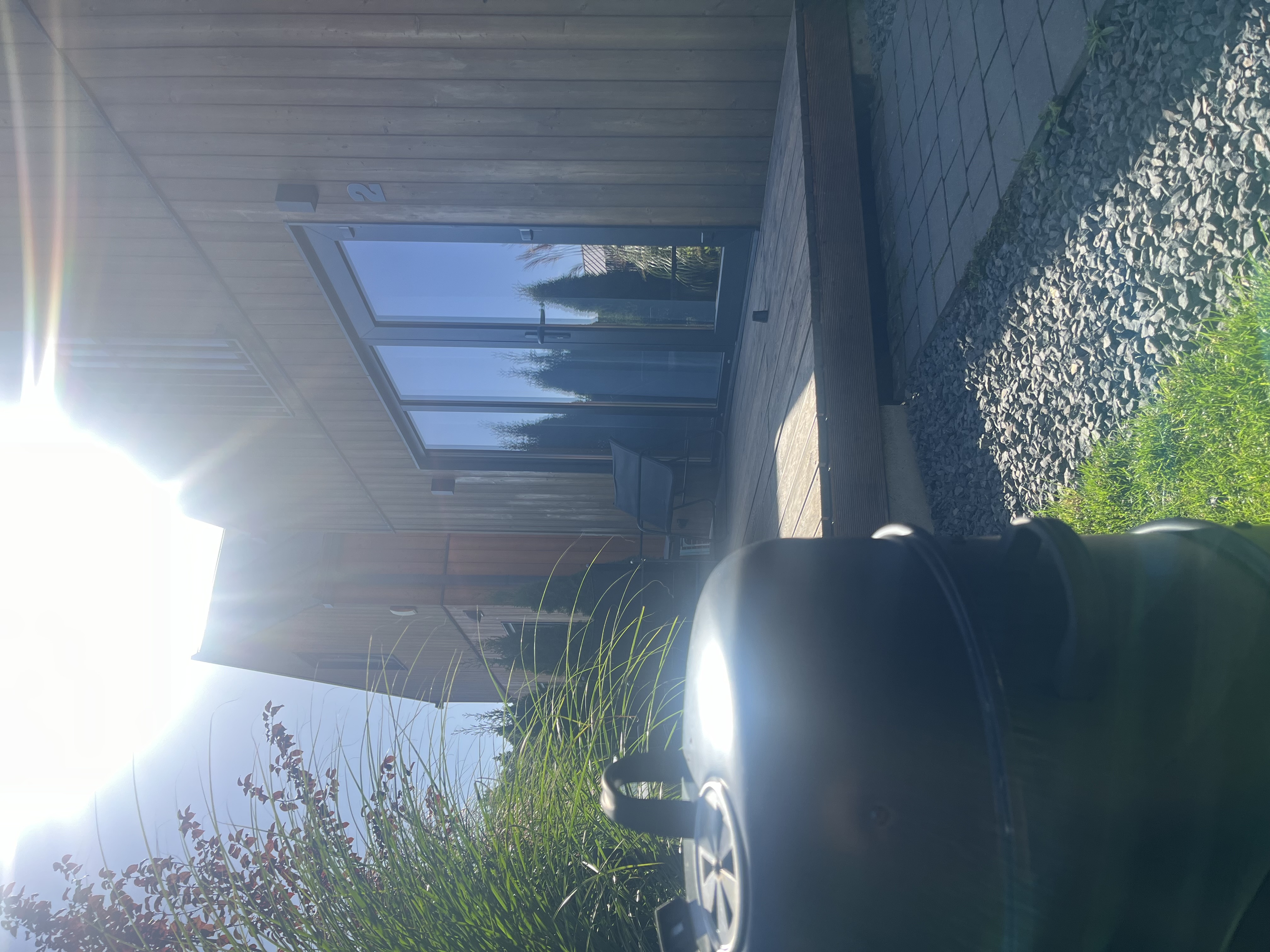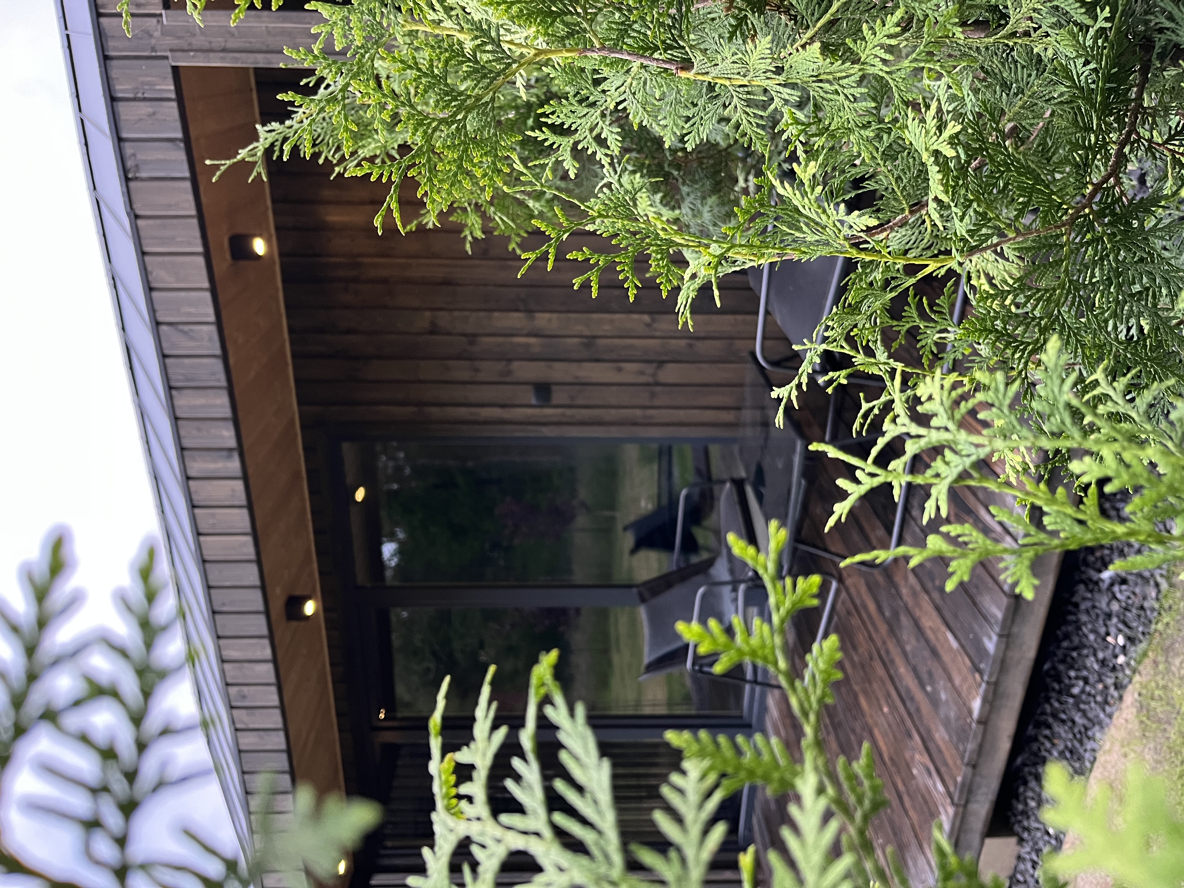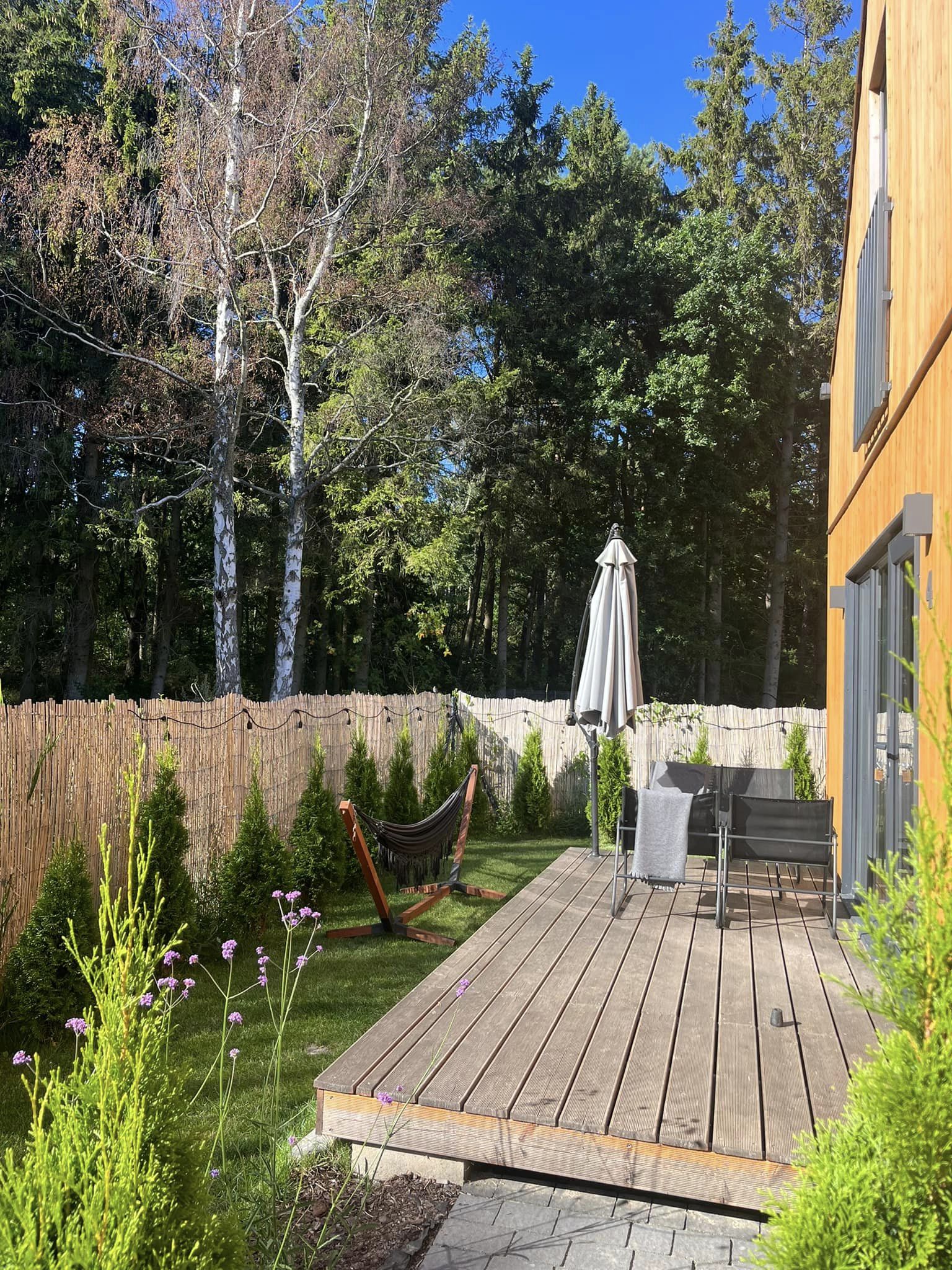 - Prywatny ogródek wydzielony roślinnością ( meble tarasowo-wypoczynkowe, widok na las)