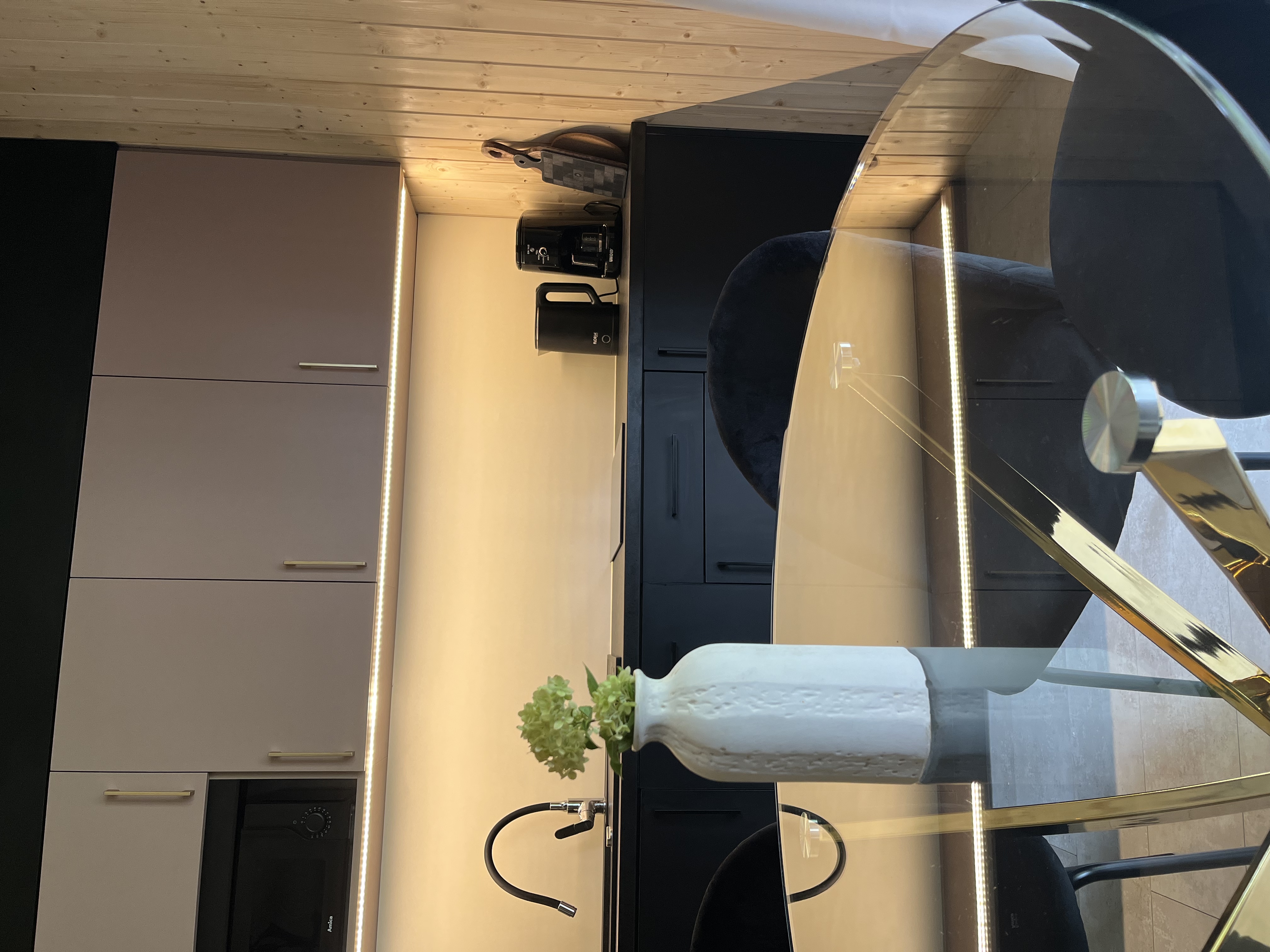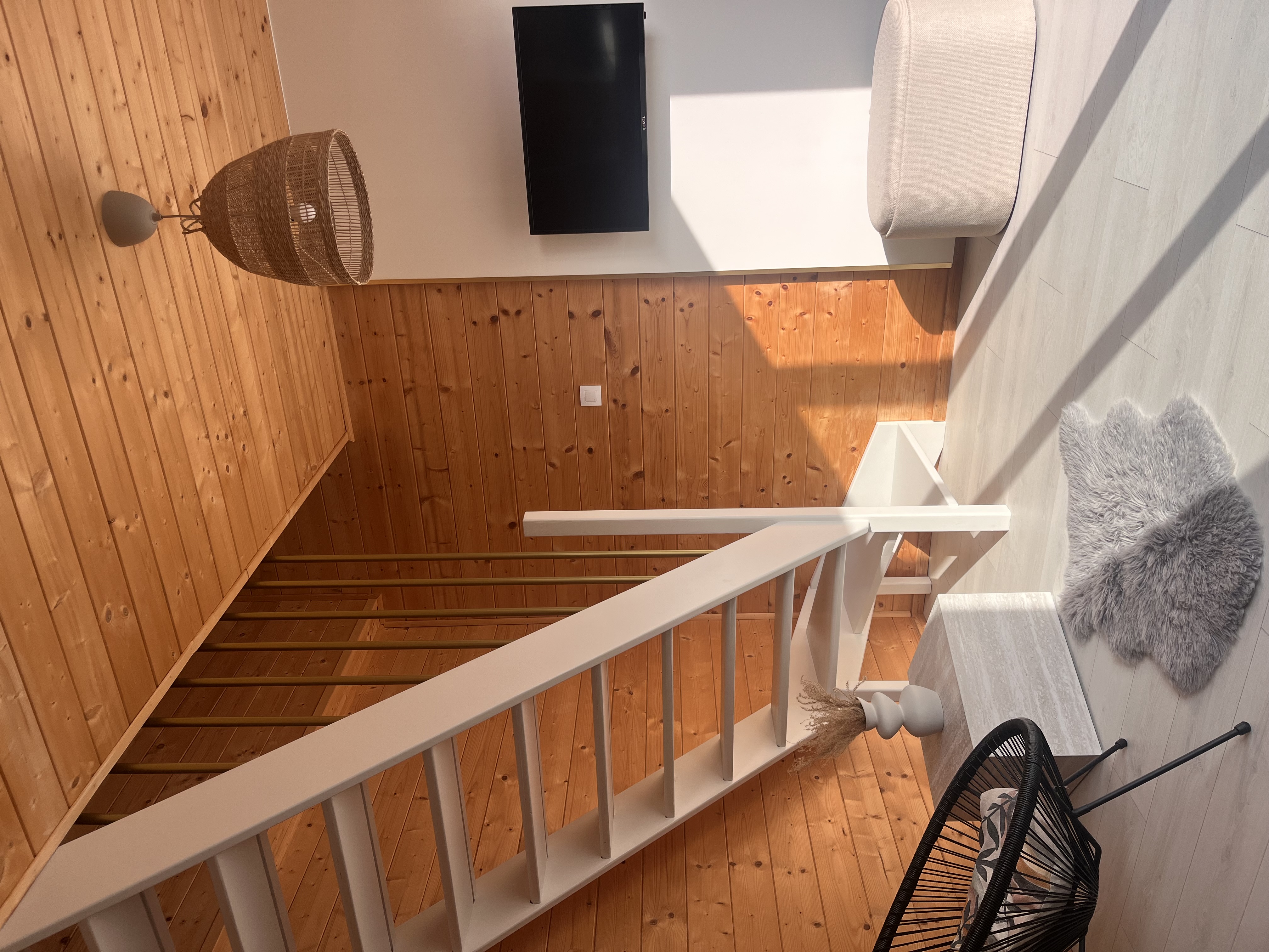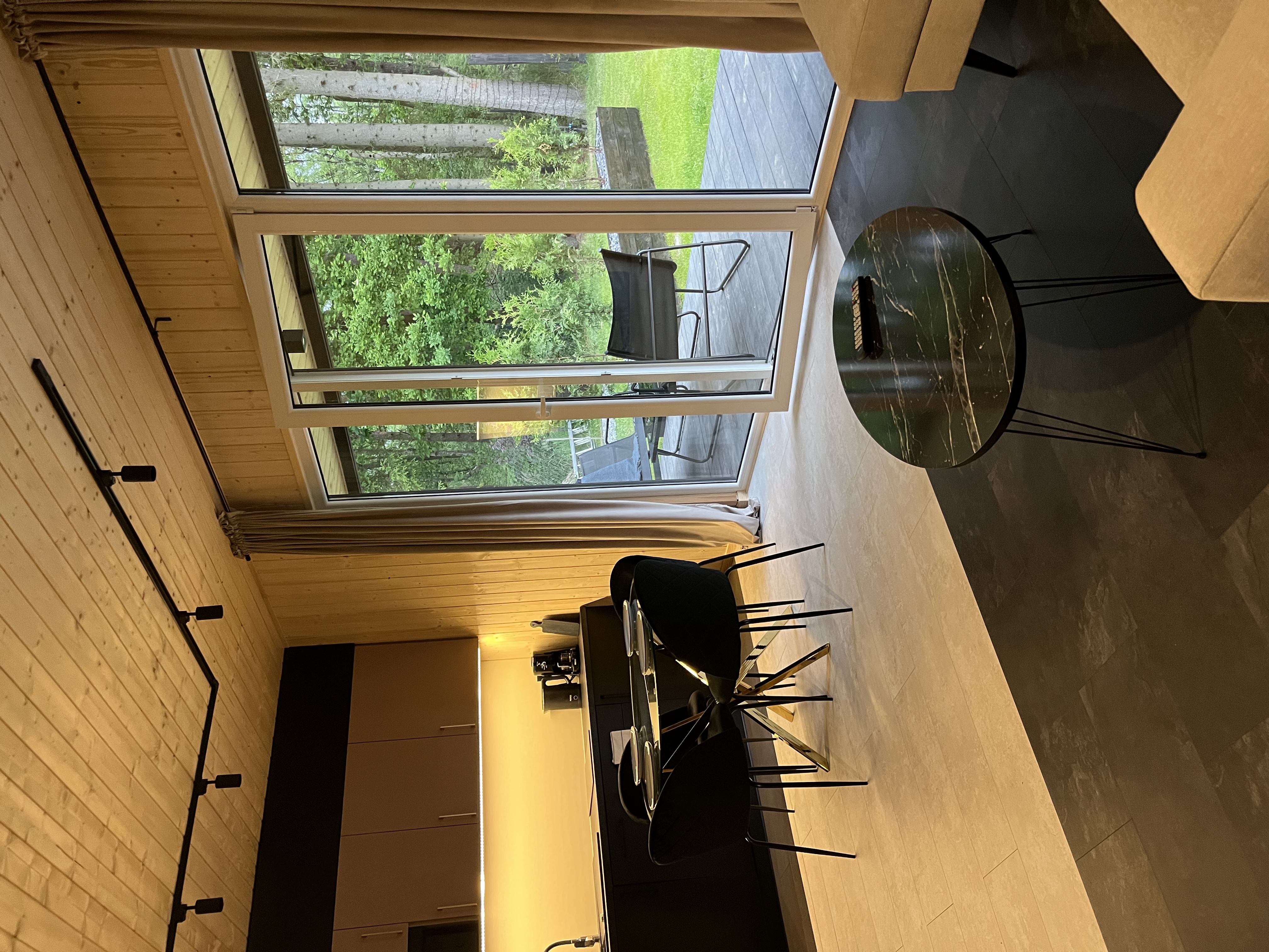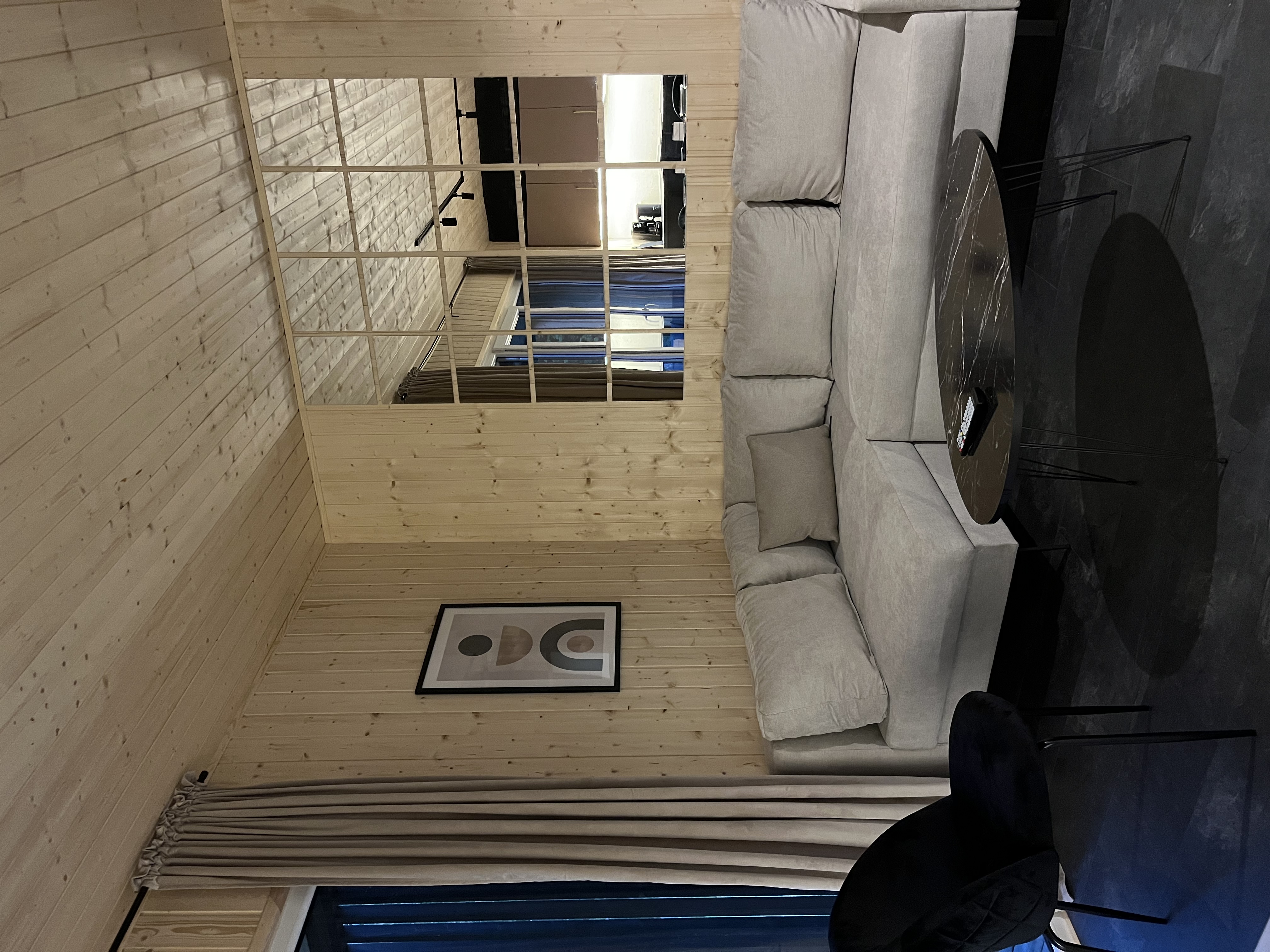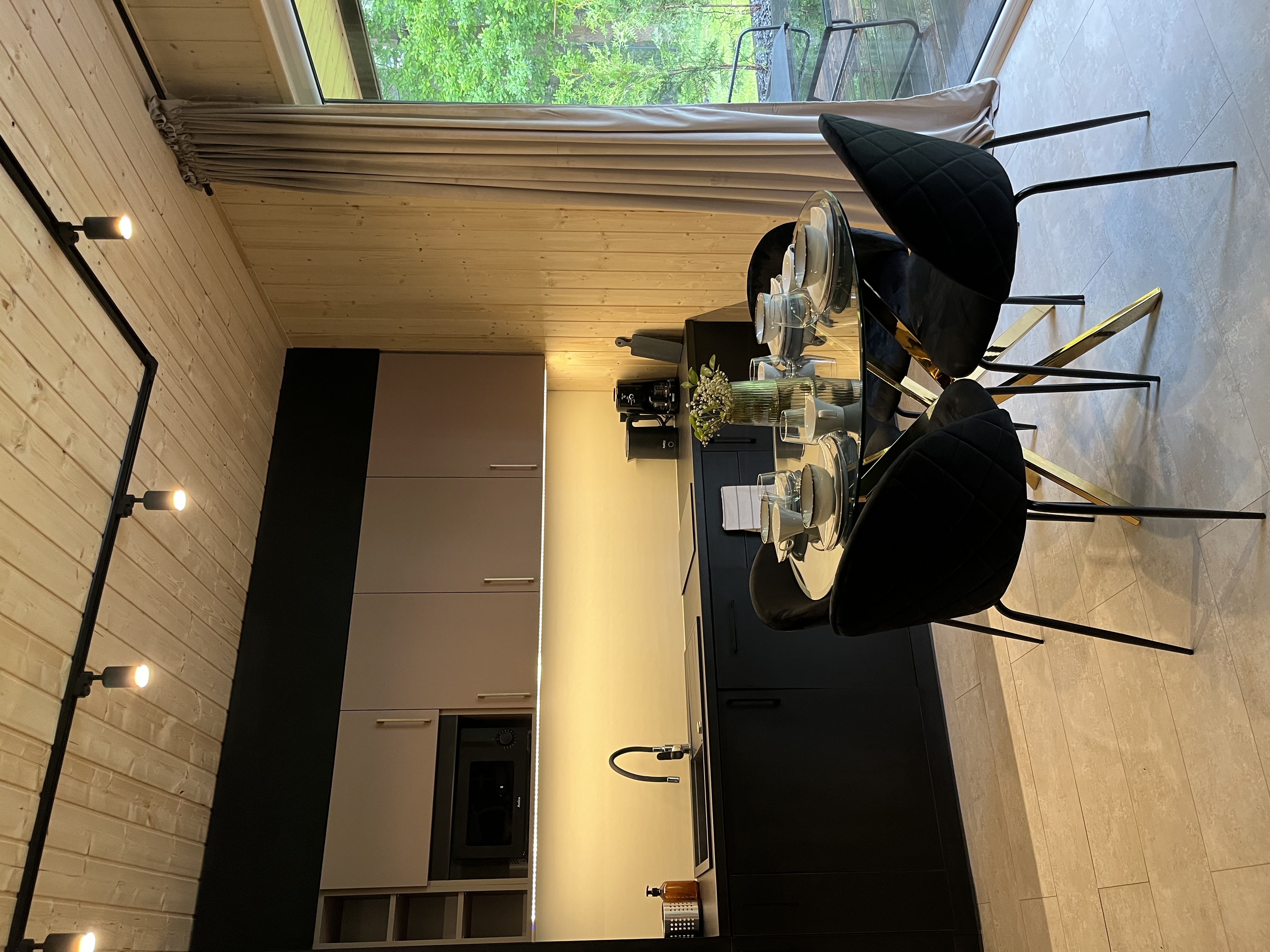 - Parter: salon z rozkładaną sofą, w pełni wyposażony aneks kuchenny, mikrofala, express do kawy oraz łazienka z prysznicem typu walk in.